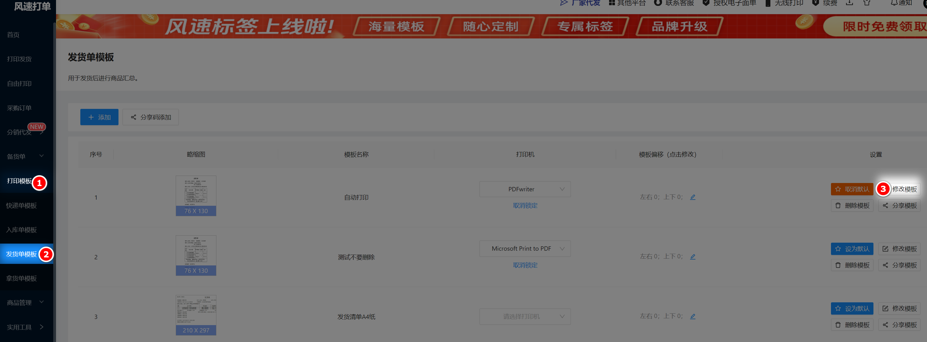 依次点击:打印模板--快递单模板--修改模板--添加昵称--保存模板