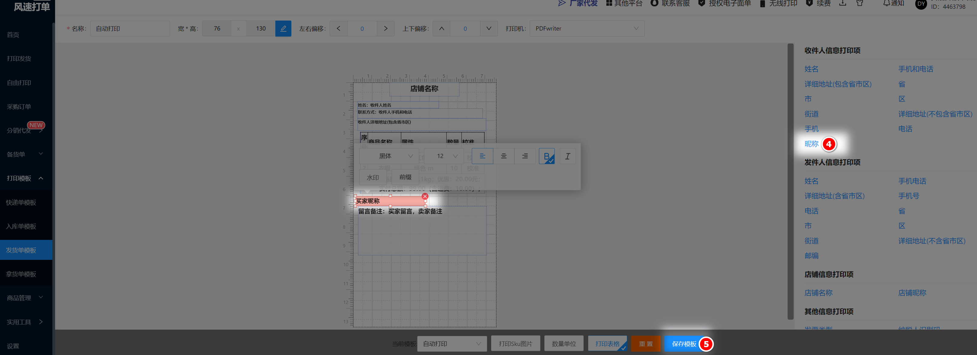 快递单/发货单模板添加昵称后,自动打印也可以打印买家昵称